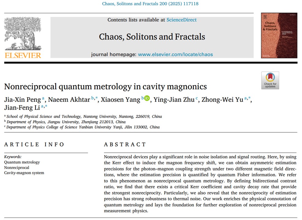 近日,公司彭家鑫博士团队与江苏大学学者合作,在非互易量子精密测量研究方面取得新进展。相关研究成果以“Nonreciprocal quantum metrology in cavity magnonics”为题发表在中科院一区Top期刊《Chaos, Solitons and Fractals》上。williamhill英国官网为第一单位。