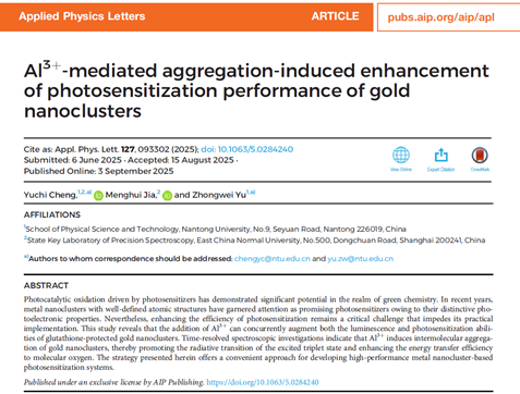 近日,公司程宇驰博士及其合作者在金属纳米团簇光催化性能调控方面取得新进展。相关研究成果以“Al3+-mediated aggregation-induced enhancement of photosensitization performance of gold nanoclusters”为题发表在自然指数期刊《Applied Physics Letters》上。williamhill英国官网为第一单位和通讯单位。