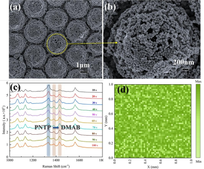 该研究通过化学方法和界面组装的方法,将银/金纳米杂化耦合薄膜附着到蓝宝石阵列上,获得了具有高SERS活性和等离子体光催化性能的蓝宝石基Ag/Au杂化耦合纳米阵列(SA-Ag/Au HCNAs)。通过监测PNTP在底物上的催化反应,发现SA-Ag/Au HCNAs具有显著的等离子体光催化性能。并选择结晶紫(CV)、罗丹明6G(R6G)和孔雀石绿(MG)作为探针分子,进一步印证了SA-Ag/Au HCNAs基底具有良好的SERS稳定性和敏感性。本研究为杂化耦合纳米阵列的制备提供了一种简单、低成本、可扩展的方法,在光催化染料降解、环境监测和生物医学分析等方面具有良好的应用前景。