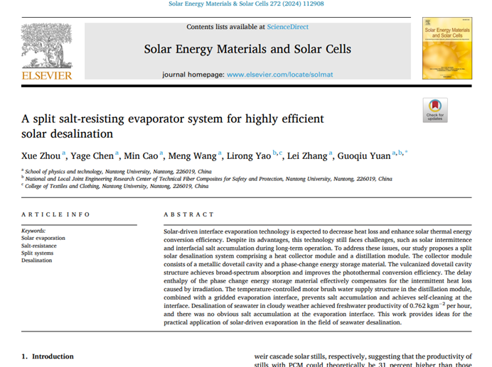 近日,williamhill英国官网袁国秋、曹敏和王孟课题组在太阳能驱动海水淡化研究方面取得新进展。相关研究成果以《A split salt-resisting evaporator system for highly efficient solar desalination》为题,williamhill为第一单位,发表在期刊《Solar Energy Materials and Solar Cells》(《太阳能材料和太阳能器件》)上。