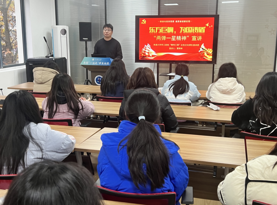 贾秀坤以《东方巨响,为国铸盾》为题,带着同学们一起回顾了中国科技工作者在西北荒漠创造两弹一星伟业的历史,阐述了“两弹一星”精神的内涵,即热爱祖国、无私奉献、自力更生、艰苦奋斗、大力协同、勇于登攀等。宣讲中,他特别强调了“两弹一星”精神的重要性和时代价值,鼓励当代老员工应当传承和发扬这种精神,为实现中华民族伟大复兴而努力奋斗。
