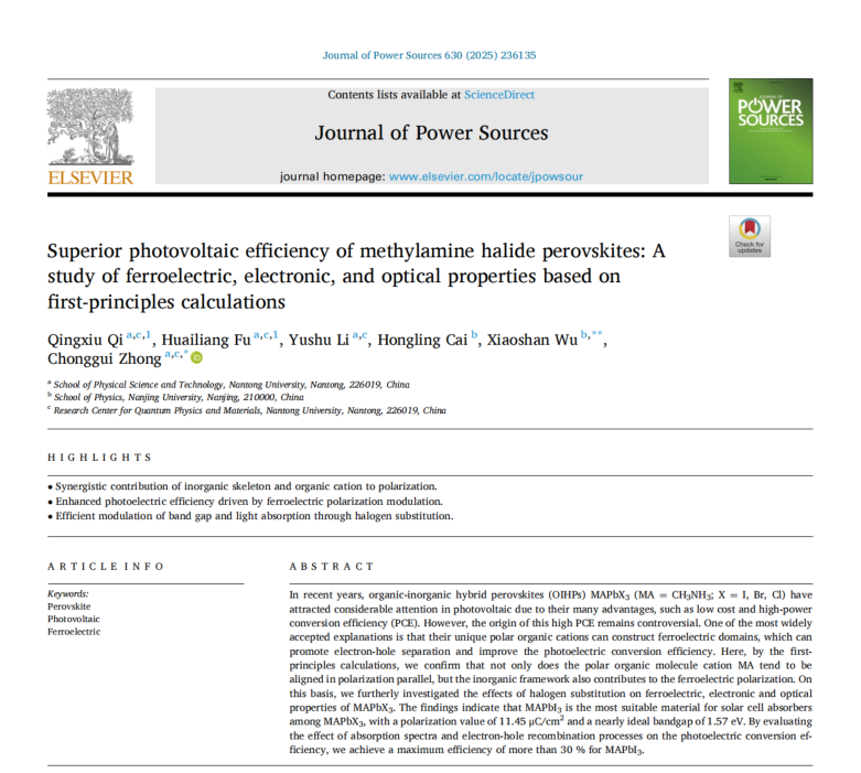 近日,公司仲崇贵教授课题组在MAPbX3(X=I, Br, Cl)钙钛矿太阳能电池的理论研究方面取得新进展。相关研究成果以《Superior photovoltaic efficiency of methylamine halide perovskites: A study of ferroelectric, electronic, and optical properties based on first-principles calculations》为题发表在《Journal of Power Sources》上,williamhill仲崇贵教授和南京大学吴小山教授为共同通讯作者,公司2022级物理学硕士生戚清秀为该论文第一作者,williamhill英国官网为第一单位。