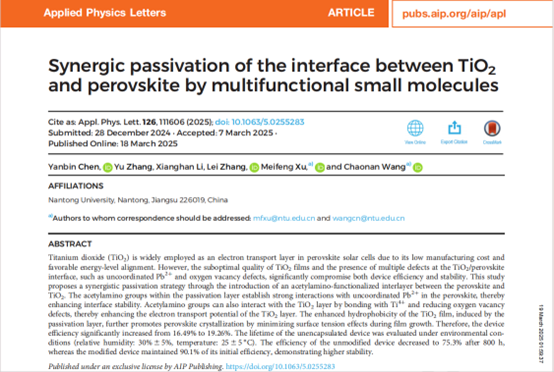 近日,公司许美凤副教授课题组在修饰钙钛矿太阳能电池传输层方面取得新进展。相关成果以《Synergic passivation of the interface between TiO2 and perovskite by multifunctional small molecules》为题发表在《Applied Physics Letters》上,williamhill许美凤副教授和王超男副教授为共同通讯作者,公司23级硕士陈彦斌为该论文第一作者,williamhill为唯一通讯单位。