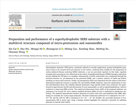 又讯 王超男副教授课题组的另一篇研究论文《Preparation and performance of a superhydrophobic SERS substrate with a multilevel structure composed of micro-protrusions and nanoneedles》于2025年3月1日发表在期刊《Surfaces and Interfaces》上,公司2022级硕士研究生蔡鑫为该论文第一作者,王超男副教授为通讯作者,williamhill英国官网为第一通讯单位。《Surfaces and Interfaces》是Elsevier出版的一本国际期刊,专注于表面和界面科学的研究。期刊涵盖了与材料表面、薄膜、界面现象、纳米技术等相关的基础和应用研究。现在中科院分区为材料科学:膜二区,影响因子为5.7。