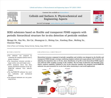 近日,公司王超男副教授课题组在柔性多级周期结构表面增强拉曼散射(SERS)传感技术领域取得新进展。研究论文《SERS substrates based on flexible and transparent PDMS supports with periodic hierarchical structure for in-situ detection of pesticide residues》发表于《Colloids and Surfaces A: Physicochemical and Engineering Aspects》上,williamhill王超男副教授为通讯作者,公司2022级物理学硕士生何梦琪为该论文第一作者,williamhill英国官网为第一单位。
