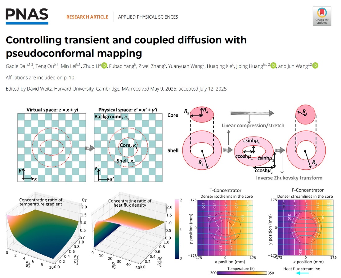 扩散现象普遍存在于自然界中,是物质与能量输运的基本模式之一。近年来,扩散超材料这一领域的兴起为利用人工结构调控扩散过程开辟了新的方向。然而传统方法难以同时实现功能材料的各向同性和界面匹配,或无法解决瞬态与多物理场耦合情境下的扩散调控问题。2023年,戴高乐博士与合作者在稳态热传导的研究中提出扩散赝共形映射(diffusive pseudo-conformal mapping)方法,利用简单的各向同性材料即可实现热流的精准重定向(https://doi.org/10.1016/j.chaos.2023.113849)。本研究进一步发展了这一方法:在研究对象上扩展到了瞬态扩散(如瞬态热传导)与多物理场耦合扩散过程(如对流-传导体系和热电体系);并构造了一类新的赝共形映射,能诱导出各向同性介质,同时满足多区域界面匹配,实现对特定区域扩散场强度的操控并且不产生外场扰动。特别对于瞬态热传导,新构造的赝共形映射给出了传统方法无法得到的精确的扩散率分布。通过赝共形映射中的几何参数设计,可以得到与常用材料比较适配的材料参数,从而方便的进行样品制备,规避了对复杂复合材料结构的需求。瞬态热传导的实验结果也验证了这一方法在真实环境中的可靠性。这项工作为复杂扩散过程的精准调控提供了新的思路。