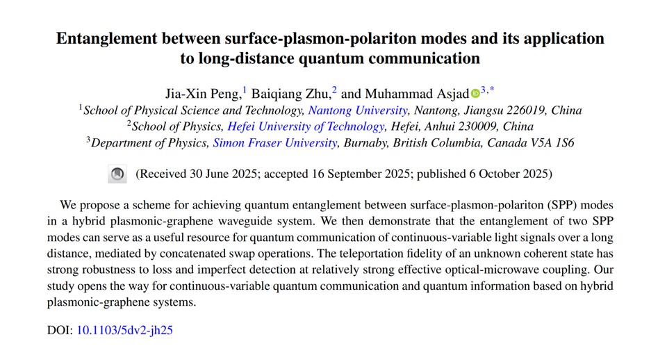 近日,公司彭家鑫博士与合肥工业大学朱百强博士后、加拿大西蒙弗雷泽大学(Simon Fraser University)Muhammad Asjad副教授合作,在量子纠缠与量子通信研究方面取得新进展。相关研究成果以“Entanglement between surface-plasmon-polariton modes and its application to long-distance quantum communication”为题发表在自然指数期刊《Physical Review A》上。williamhill英国官网为第一单位。