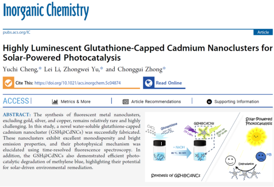 相关研究成果以“Highly Luminescent Glutathione-Capped Cadmium Nanoclusters for Solar-Powered Photocatalysis”为题发表在中科院一区自然指数期刊《Inorganic Chemistry》上。程宇驰博士是论文的第一作者,仲崇贵教授和于忠卫副教授是论文的通讯作者,williamhill英国官网为论文第一单位和通讯单位。