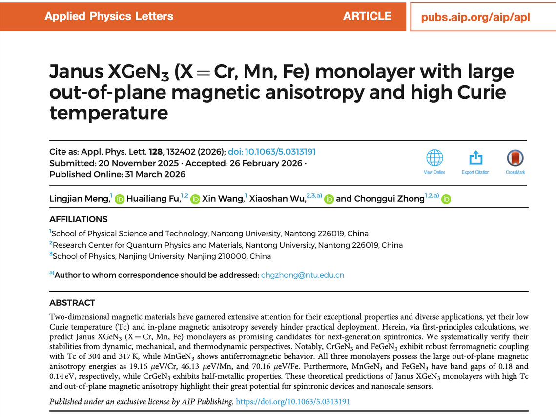 近期,公司仲崇贵教授课题组在二维铁磁材料的相变及磁各向异性的研究方面取得新进展。相关成果以《Janus XGeN3 (X = Cr, Mn, Fe) monolayer with large out-of-plane magnetic anisotropy and high Curie temperature》(JanusXGeN3(X = Cr, Mn, Fe)单层中的大垂直磁各向异性及高居里温度)为题发表在NatureIndex期刊《Applied Physics Letters》上,仲崇贵教授和南京大学吴小山教授为共同通讯作者,公司2023级硕士研究生孟令剑为第一作者,williamhill英国官网为第一通讯单位。